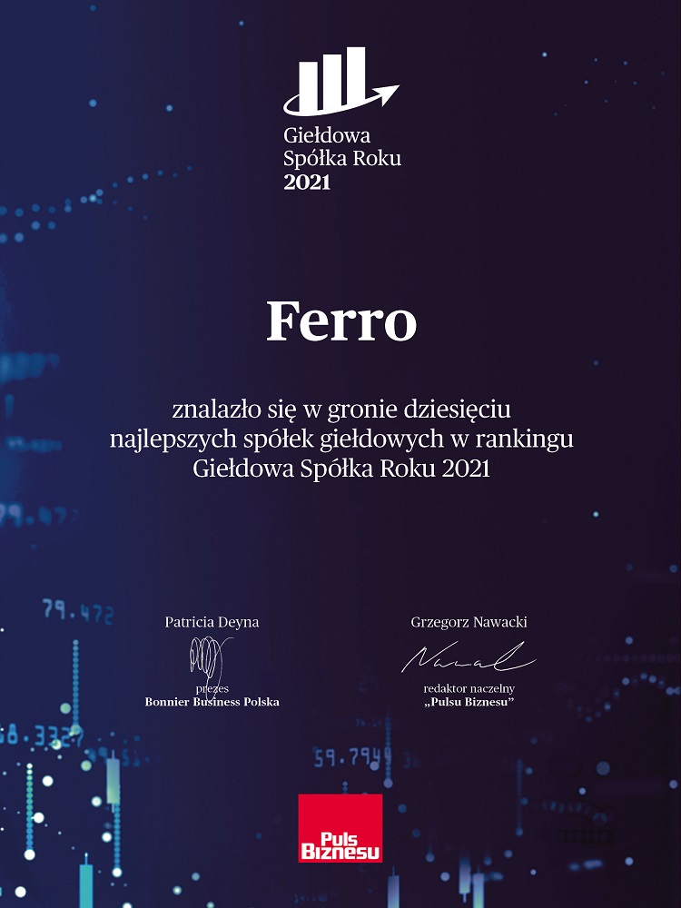 To zaszczytne wyróżnienie stawia FERRO w gronie spółek należących do elity polskiego rynku kapitałowego, które rozwinęły biznes, posiadają świetne perspektywy rozwoju, oferują klientom najwyższej jakości produkty i usługi, postawiły na innowacje i zachowują najwyższe standardy komunikacji z inwestorami. Wyniki rankingu są dowodem na to, iż FERRO należy do firm, które warto naśladować, doceniać i promować, są także cenną wskazówką dla inwestorów giełdowych.