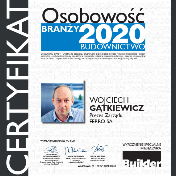 Osobowością Branży z ramienia firmy został Wojciech Gątkiewicz − Prezes Zarządu Ferro Group. Wyróżnienie jest uznaniem talentu i managerskich sukcesów w zarządzaniu biznesem na wymagającym i konkurencyjnym rynku, a także dowodem na efektywność realizowanych strategii w sytuacji zarządzania kryzysowego. Wyróżnienie Budowlana Firma Roku potwierdza osiągnięcia i wysoką pozycję firmy na rynku w pełnym wyzwań i trudności związanych z zaistniałą sytuacją pandemiczną 2020 roku. Obie zaszczytne nagrody są dowodem na niekwestionowane miejsce Ferro i jej przywódców w gronie liderów branży, wszystkich uczestników procesu inwestycyjnego oraz firm i organizacji wspierających branżę działających na rzecz polskiego budownictwa, nauki i edukacji.