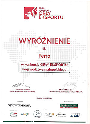 Miło nam poinformować, iż firma FERRO znalazła się w gronie liderów eksportu Województwa Małopolskiego zdobywając wyróżnienie w konkursie Regionalne Orły Eksportu 2016. Wyróżnienie  zostało przyznane na podstawie analizy wyników finansowych firmy w latach 2012 – 2014. Znaczącym kryterium był wzrost eksportu, nie mniejszy niż 20% we wspomnianym okresie, a także 40% udział eksportu w przychodach osiągniętych w 2014 roku.